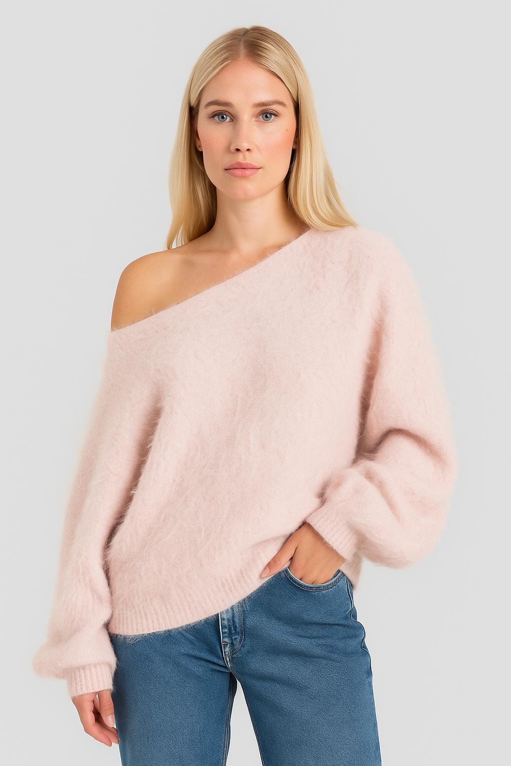 Embla Breeze Sweater är en oversized off-shoulder-tröja skapad för de där lugna stunderna när du bara vill andas ut och känna dig fri. Den fluffiga stickningen omfamnar kroppen med en lyxigt mjuk känsla som värmer utan att tynga.